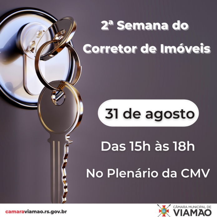 Na próxima quarta-feira (31), a Câmara Municipal de Viamão – CMV realizará sessão especial e solene em comemoração à 2ª Semana do Corretor de Imóveis em Viamão, a ser realizada no dia 31 de agosto, das 15h às 18h, no Plenário Tapir Rocha.