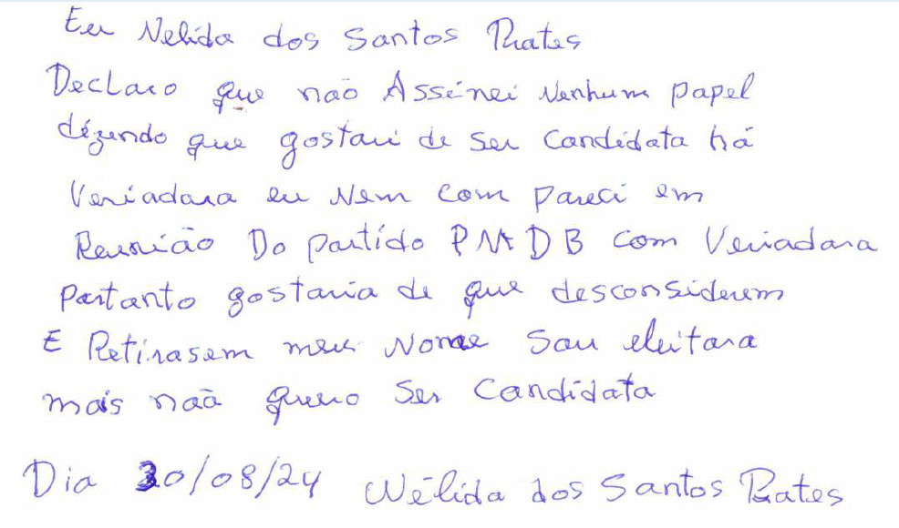 3 – Importante apontar que a Sra. NÉLIDA retornou à sede da Promotoria de Justiça em 04.09.2024, munida de uma minuta de renúncia elaborada pelo partido a fim de postular orientações sobre qual providência deveria adotar em relação aquele documento (datado de 15.08.2024), ou seja, se o firmava ou não. Deste modo, inegável que a cópia do documento acostado na contestação foi assinado pela sra. NÉLIDA posteriormente ao dia 15 de agosto, tão logo a notícia da possível fraude foi veiculada na imprensa e redes sociais. A prova testemunhal judicial também confirma tal situação. (…)