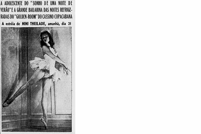 Em 1940 Nini Theilade veio com a Companhia de Massine ao Brasil, para uma temporada no Casino Atlântico. Ela regressou ao Brasil em 1921, 1942 e em 1945, todas as viagens feitas de navio durante a Segunda Guerra Mundial, o que era considerado muito perigoso.