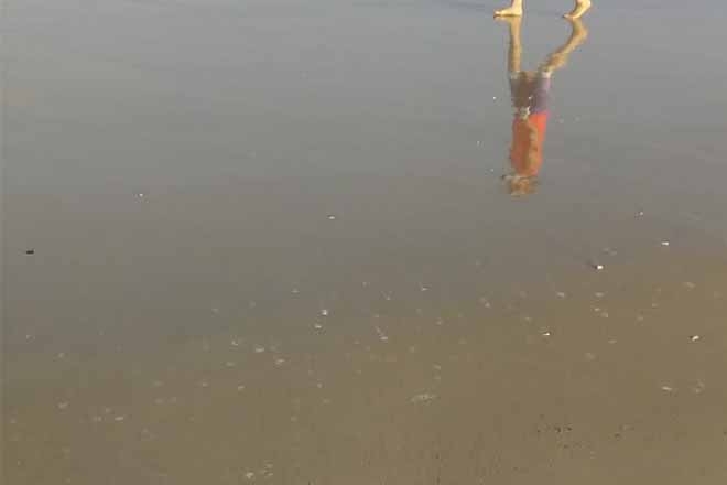 Ao longe uma família com uma criança pequena. Tudo para ela é novidade. Desde a coleta de algumas conchinhas do mar, até aos pássaros que circulam e voam ao seu redor, em disparada. Depois, essas aves param, se alimentam de pequenos fragmentos de algas que a maré traz. Literalmente tudo é bicado, experimentado entre voos rasantes e bem próximos da criança, que observa e parece entender.