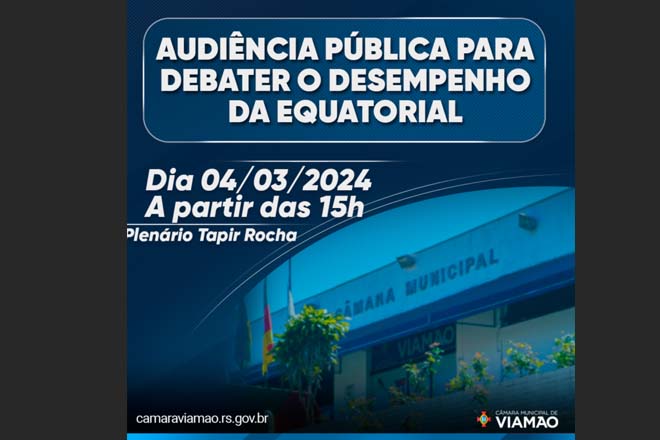 Na próxima segunda-feira, dia 04 de março de 2024, a partir das 15h, a Câmara Municipal de Viamão realizará, por iniciativa da vereadora Fátima Maria – PT (Mandato Coletivo Teremos Vez), audiência pública para debater questões acerca da atuação e desempenho da empresa prestadora de serviço de energia elétrica CEEE Equatorial. O evento acontecerá no plenário Tapir Rocha.