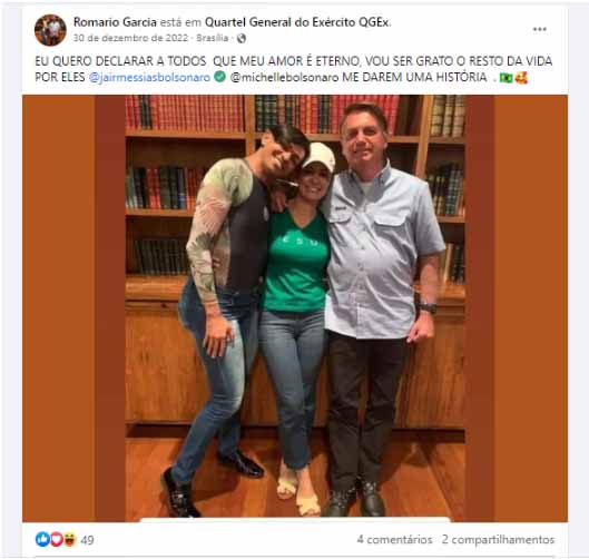 Próximo da ex-primeira dama Michelle Bolsonaro, ele ficou preso por envolvimento na invasão do 8 de janeiro por cerca de dois meses, até ser libertado provisoriamente a mando do ministro Alexandre de Moraes em 13 de março passado, segundo o STF. Sem qualquer vínculo profissional com a área de atuação do GSI, Garcia também frequentou o acampamento na frente do QG do Exército, conforme suas redes sociais – consultadas pela Pública durante o processo de apuração.