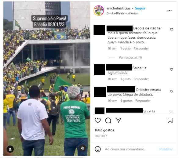 – [Havia] pessoas deles [GSI] dentro do acampamento, ‘dando força’, e depois [participaram] no processo de depredação que aconteceu – acrescentou.