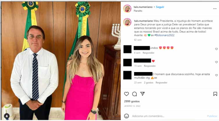 Os registros mostram que Garcia possivelmente foi acompanhado da empresária bolsonarista Taís Avelar Numeriano de Sá, que entrou às 11h01 – mais uma pessoa sem vínculo com a área de segurança, foco do GSI. Em suas redes, ela tem uma foto ao lado do então presidente Jair Bolsonaro, em 12 de janeiro de 2022, no gabinete presidencial.