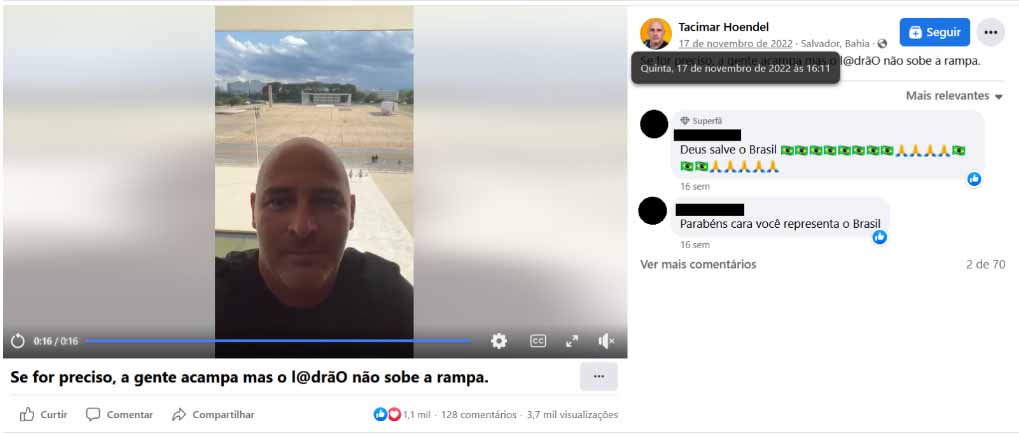 A grafia cifrada do termo “ladrão” serve para tentar driblar a moderação das redes sociais, que tende a derrubar afirmações golpistas e desinformativas. O conteúdo de Hoendel foi visto mais de 3,7 mil vezes, com 1,1 mil curtidas e 128 comentários no Facebook.