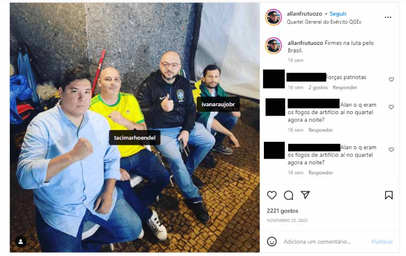 Uma foto publicada por outro bolsonarista, o blogueiro Allan Frutuozo, fortalece os indícios da presença de Hoendel e Cabo Ivan no acampamento golpista. Dono do canal e site Vista Pátria, ligado à extrema direita, Frutuozo está ao lado de ambos na imagem, captada em frente ao QG do Exército: “Firmes na luta pelo Brasil”, escreveu o blogueiro em 25 de novembro. A foto teve mais de 2,2 mil curtidas.