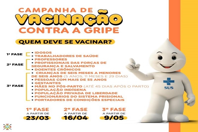 - 3ª FASE - A última fase, que vai de 9 até 22 de maio, tem como prioridade crianças de seis meses a menores de seis anos (5 anos, 11 meses e 29 dias), pessoas com mais de 55 anos, gestantes, mães no pós-parto (até 45 dias após o parto), população indígena, população privada de liberdade, funcionários do sistema prisional e portadores de condições especiais.