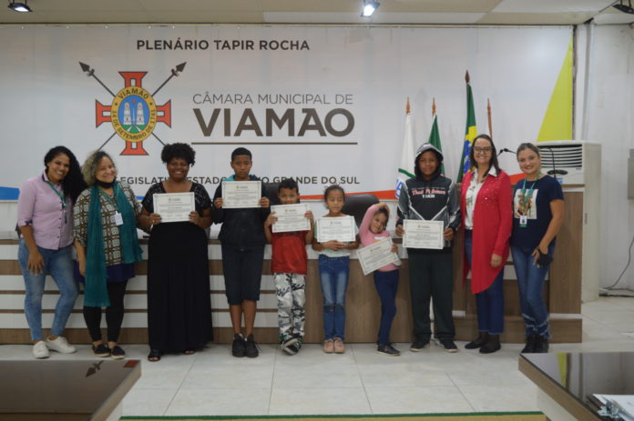 Na manhã desta terça-feira (19), na Câmara Municipal de Viamão – CMV, aconteceu a primeira edição do ano de 2022 da Escola do Legislativo, projeto criado na Legislatura de 2018. O encontro reuniu cinco crianças do CRAS Monte Alegre. A vereadora Denise Guedes – PSDB recebeu os alunos, fez a entrega de certificados, explicou o funcionamento da Câmara, indagou os pequenos sobre quais leis fariam se fossem vereadores por um dia.