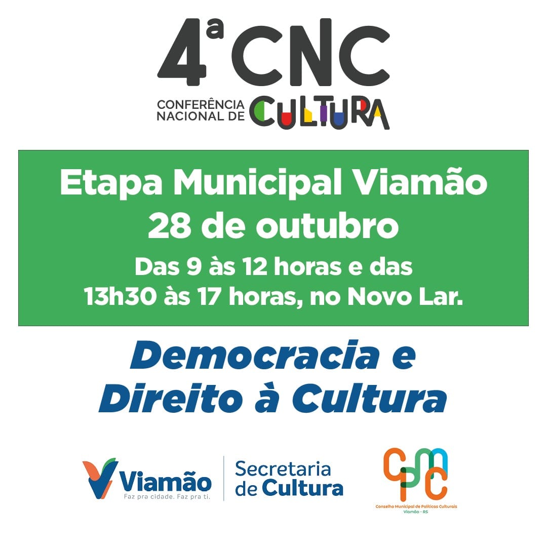 A Secretaria Municipal de Cultura (SMC) convida a todos para a 6ª Conferência Municipal de Cultura, a ser realizada dia 28 de outubro, das 9 às 12 horas e das 13h30 às 17 horas, no Novo Lar (avenida Dom Bosco, 424, Jardim Krahe). O tema deste ano é “Democracia e Direito à Cultura”. Serão debatidos seis eixos, eleitos delegados e levados os apontamentos para a Conferência Estadual de Cultura.