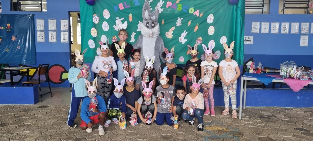 Teve até a presença do Coelhinho da Páscoa, graças à colaboração do pai de uma aluna, o locutor Miro Rodrigues, para a alegria da gurizada.