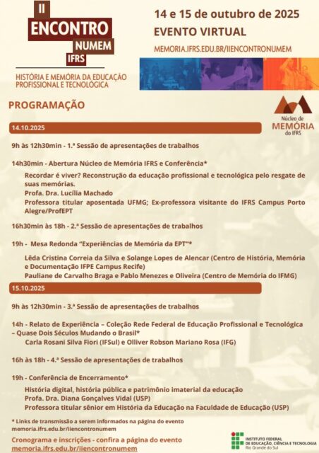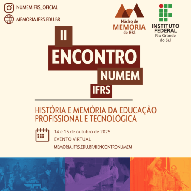 O II Encontro NuMem/IFRS – História e Memória da Educação Profissional e Tecnológica recebe inscrições de trabalhos até 31 de agosto de 2025. Interessados em participar como ouvintes podem se inscrever até 30 de setembro. O evento será realizado nos dias 14 e 15 de outubro de 2025, de forma virtual, nos turnos da manhã, tarde e noite, organizado pelo Núcleo de Memória do Instituto Federal de Educação, Ciência e Tecnologia do Rio Grande do Sul (IFRS).