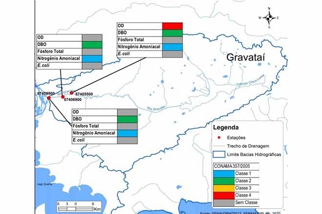 O estudo destaca tristemente a foz do Gravataí como o pior trecho hídrico de todo o Estado. Neste ponto, em todas as análises, o nível de oxigênio dissolvido chegou, na melhor das hipóteses à classe 4, a pior entre os índices considerados pelo Conama. As amostras de fósforo total e de coliformes, por exemplo, foram consideradas "sem classe", ou seja, abaixo da crítica.