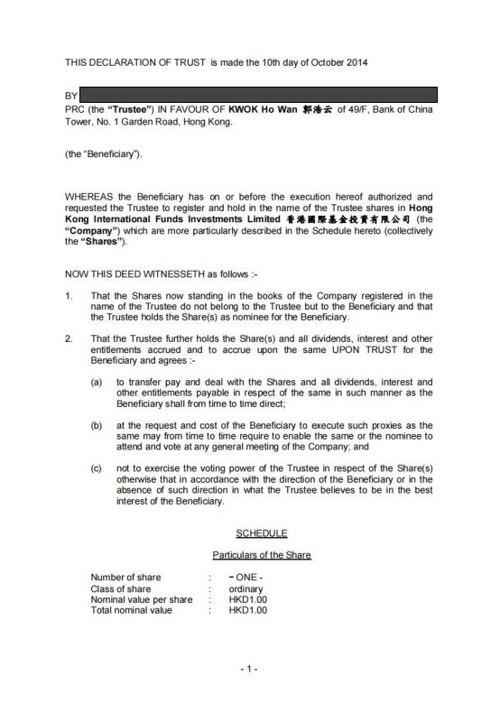 A Declaração de Fideicomisso deixava claro que todos os atos da curadora, Natasha Qu, em relação à propriedade das ações da empresa deveriam seguir as instruções do beneficiário, Guo Wengui. Após Qu ter assinado a Declaração de Fideicomisso, ela afirmou que o documento foi levado por Guo e mantido em poder de seu advogado.