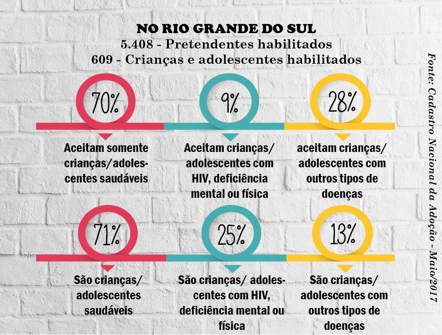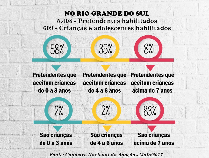 Elas ficam, muitas vezes, até completar a maior idade. Os 18 anos chegam mais rápido do que uma nova família. Enquanto aguardam para ser adotadas, 1.081 crianças e adolescentes moram em 95 abrigos e casas lares na cidade de Porto Alegre. Só no Rio Grande do Sul, são 5.408 casais habilitados para 609 crianças prontas para ser adotadas. Mas por que, ainda com a discrepância desses números, o problema de adoção no estado não é resolvido?