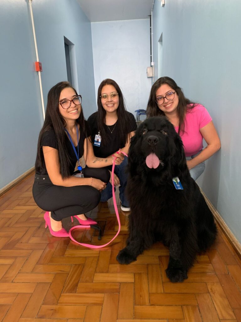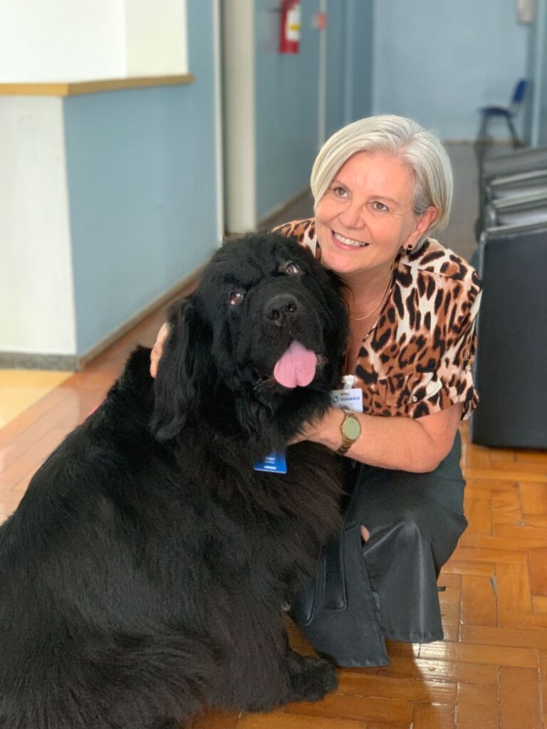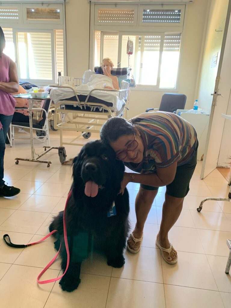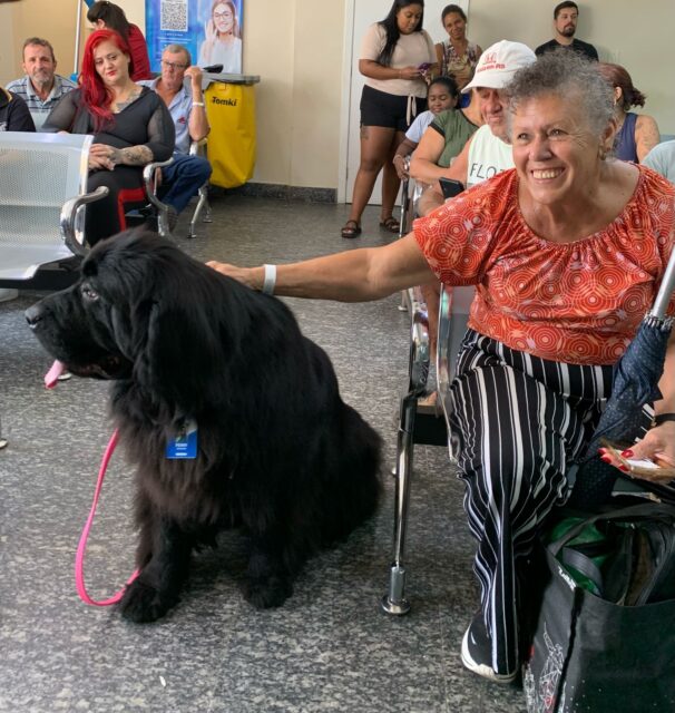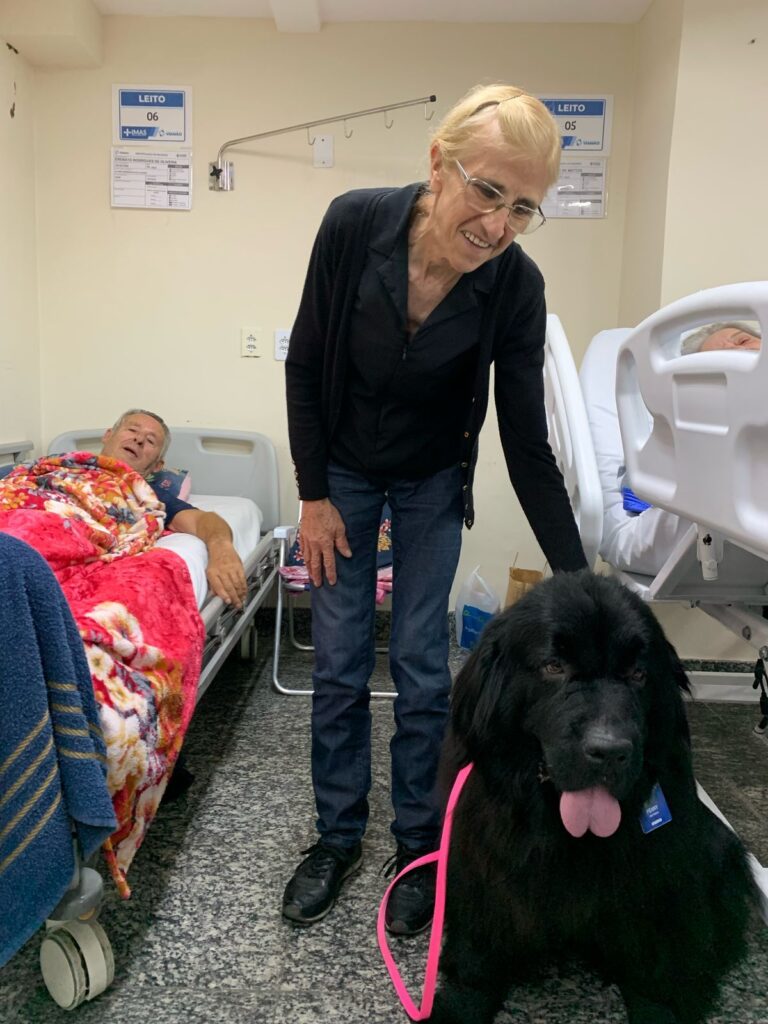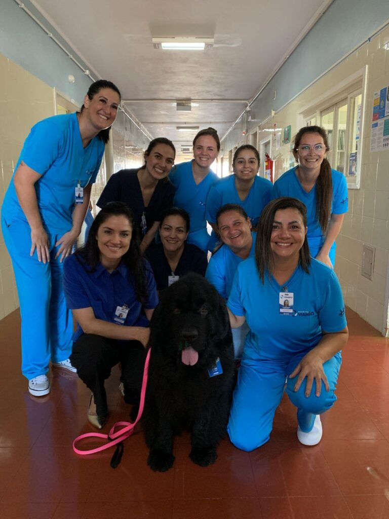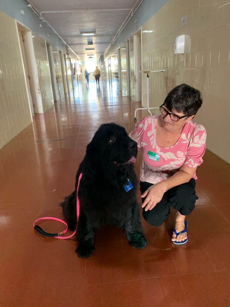 Com o propósito de humanização e acolhimento, o Instituto Maria Schmitt (Imas) implantou, no Hospital Viamão, a Terapia Assistida por Animais, ou popularmente a “cãoterapia”, que auxilia na evolução da reabilitação dos pacientes e também confere leveza no dia a dia do trabalho dos colaboradores. Nesta terça-feira, dia 18, a unidade hospitalar recebeu pela segunda vez a visita ilustre da Penny, da raça Terra Nova, a protagonista do projeto em parceria com o Canil Double Axe, de Araranguá, Santa Catarina, com objetivo de estimular a socialização e contribuir para a reabilitação dos pacientes.