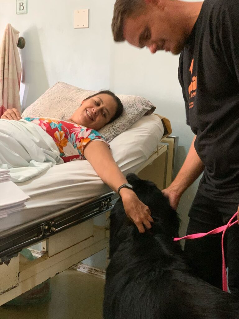 Internada no Hospital Viamão, Brandina Mesquita Godoi ficou emocionada com a visita da Penny, já que ama muito os animais. “Estou há alguns dias internada e a visita dela me deu saudade do meu cachorro Luke, que está em casa me esperando. Ela é muito mansinha e enorme, brinquei com ela, abracei ela.”, falou, emocionada com a presença da pet. Para Brandina, o contato do cão no ambiente hospitalar é muito importante. “A Penny fez bastante diferença no nosso dia, ficamos animados quando tem uma visita boa assim. Com certeza gostaria muito de ter essas visitas da Penny novamente”, destacou Brandina.