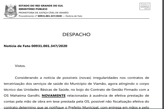 Após relatos de atraso no pagamento de salários para aproximadamente 200 enfermeiros, técnicos em enfermagem, médicos e agentes de saúde do município, a Promotoria de Justiça Cível de Viamão analisará os contratos da Prefeitura com a Associação Mahatma Gandhi. A terceirizada tem contrato de R$ 1,8 milhão mensais para realizar a gestão dos atendimentos em 16 unidades básicas e prestar serviços na área da Saúde Mental.