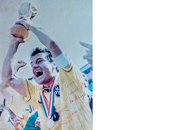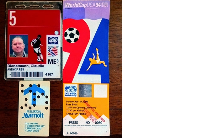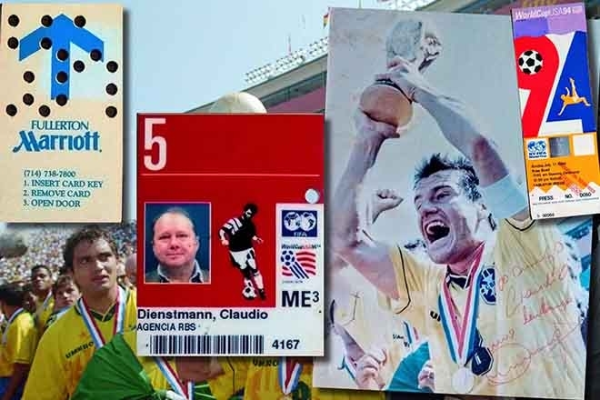 Isso tudo não é balaca, nem para se prosear, mas o jornalista guarda com saudade e orgulho a chave do apartamento do Marriott, o ingresso número 50 da final no Rose Bowl, a credencial 4167 de 1994, e um presente que recebeu de Dunga tempos depois: uma moldura com a foto autografada do capitão com a camiseta do tetra e levantando a Copa, gritando “é nossa, porra”!