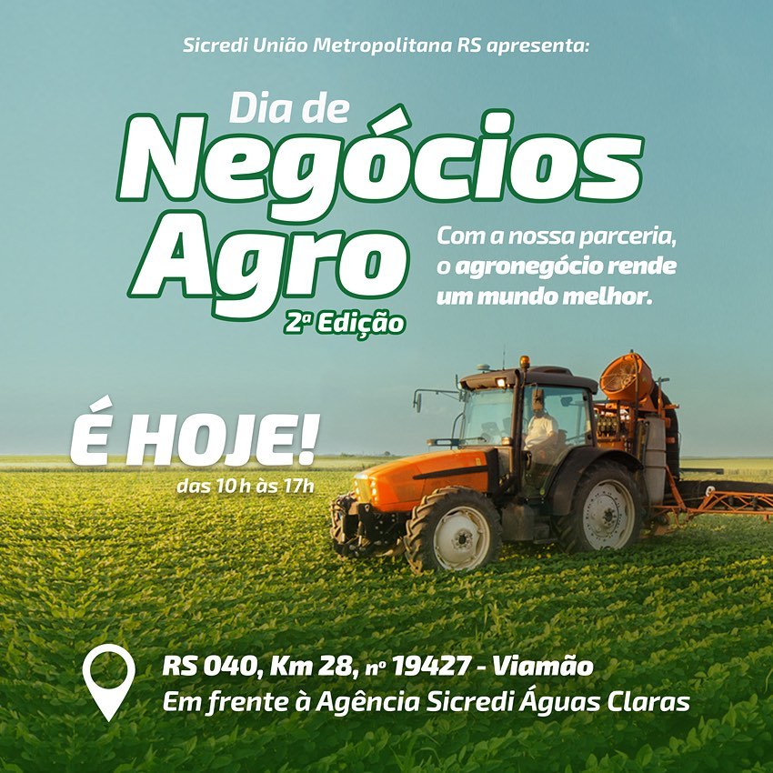 A Sicredi União Metropolitana RS, que traz na sua essência a valorização e o apoio ao produtor rural, bem como o comprometimento com o desenvolvimento das regiões onde atua, realiza no dia 31/05, terça-feira, das 10h às 17h, em Viamão, a 2ª edição do “Dia de Negócios Agro”. A feira, na RS 040, km 28, 19427, na frente da agência Águas Claras, conta com a participação de 14 grandes marcas do setor agro e tem o apoio da Prefeitura de Viamão, Secretaria da Agricultura e Abastecimento do município, Emater RS, Farsul/ Senar, Irga, Coperav (Cooperativa dos Produtores Orgânicos de Reforma Agrária de Viamão) e Sindicato Rural.