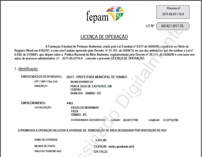Após um intenso trabalho que colocou o aterro nos padrões exigidos pelos órgãos ambientais, a Prefeitura de Viamão conseguiu a Licença de Operação para Recuperação do Aterro Controlado, localizado no Passo do Morrinho. O documento, que tem validade de cinco anos, foi emitido pela Fundação Estadual de Proteção Ambiental (Fepam) e divulgado na última semana.