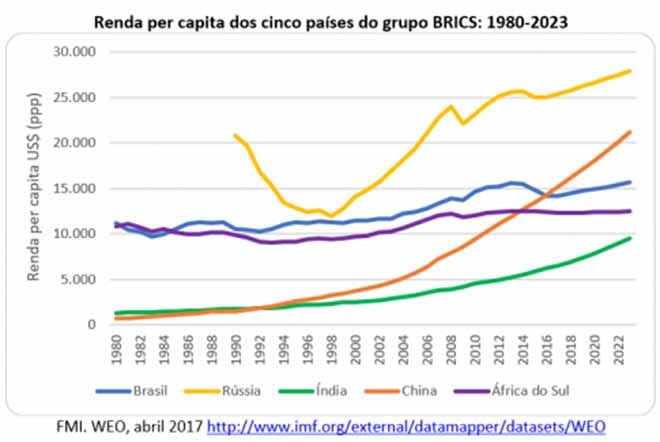 Em termos de renda per capita (em ppp), a Rússia sempre apresentou os maiores valores, em segundo lugar vinha o Brasil, depois a África do Sul, seguido da Índia e a China com a menor renda per capita durante toda a década de 1980. Em 2018, a Rússia continuava com a maior renda per capita, mas a China assumiu o segundo lugar, deixando Brasil e África do Sul para o terceiro e quarto lugar. A Índia está em quinto lugar, mas apresenta o crescimento mais acelerado da renda per capita em todo o período e pode ultrapassar o Brasil e a África do Sul na década de 2020.
