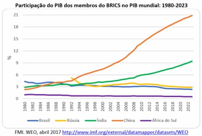 O gráfico acima mostra que havia certa proximidade na participação do PIB de cada país do BRICS no PIB mundial, na virada do milênio. Em 2001, o PIB da China representava 7,8% do PIB global, o da Índia representava 4,3%, da Rússia 3,4%, Brasil 3,1% e África do Sul 0,7%, segundo dados do FMI, de abril de 2018, em poder de paridade de compra (ppp, na sigla em inglês). Mas as diferenças aumentaram nos anos seguintes. Em 2018, o PIB da China passou para 18,7% do PIB mundial, a Índia passou para 7,7%, a Rússia caiu para 3,1%, o Brasil caiu para 2,5% e a África do Sul caiu para 0,6%. O PIB conjunto do BRICS subiu de 19,3% do PIB global em 2001 para 32,6% em 2018, sendo que o PIB do RIC passou de 15,5% para 29,5%, no mesmo período. Ou seja, enquanto o RIC quase dobrou de tamanho, a soma de Brasil e África do Sul caiu de 3,8% em 2001, para 3,1% em 2018.