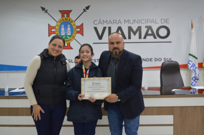 Na sessão ordinária desta terça-feira (14), na Câmara Municipal de Viamão – CMV, o vereador Rodrigo Pox – PDT entregou diploma de parabenização a patinadora Laura Costa Pereira, que foi campeã do título Sul-Americano de patinação artística na categoria Free Dance Mini Infantil, na cidade de San Juan, Argentina.